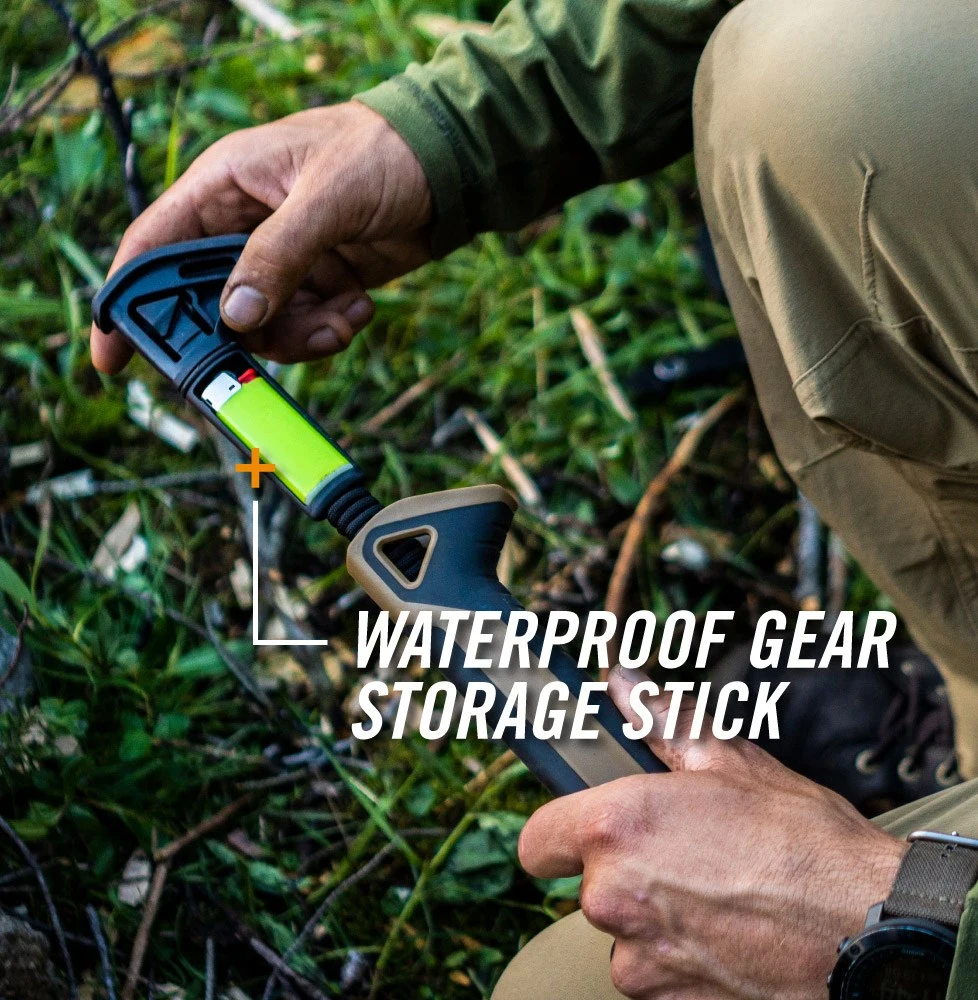 Og så ligger der en genialitet i, hvad du ikke kan se, nemlig en udtagelig kile, der indeholder 9′ rebsnor til nødvendige småopgaver og et par geniale opbevaringsrum, som grundet O-pakningen er vandtætte og som kan rumme både et lille ildstål, en lille lighter eller lidt kvas til optænding, så du har altid har tørt optændingsmateriale tilgængelig.