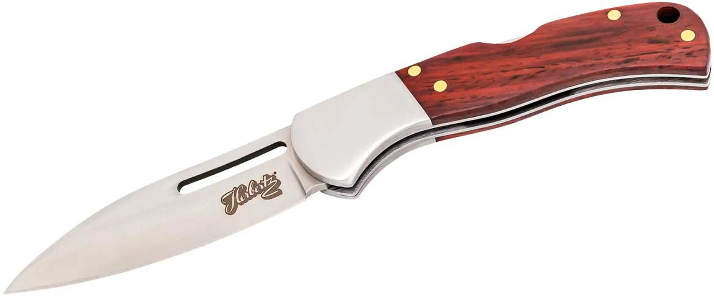 Denne enhåndsbetjente One-Handed Sandalwood Folding Knife Satin AISI 440 fra Herbertz’ Selection-serie er udstyret med et satineret drop point-blad af rustfrit AISI 440-stål, som let tilgås og åbnes ved hjælp af udskæringen øverst på klingen.