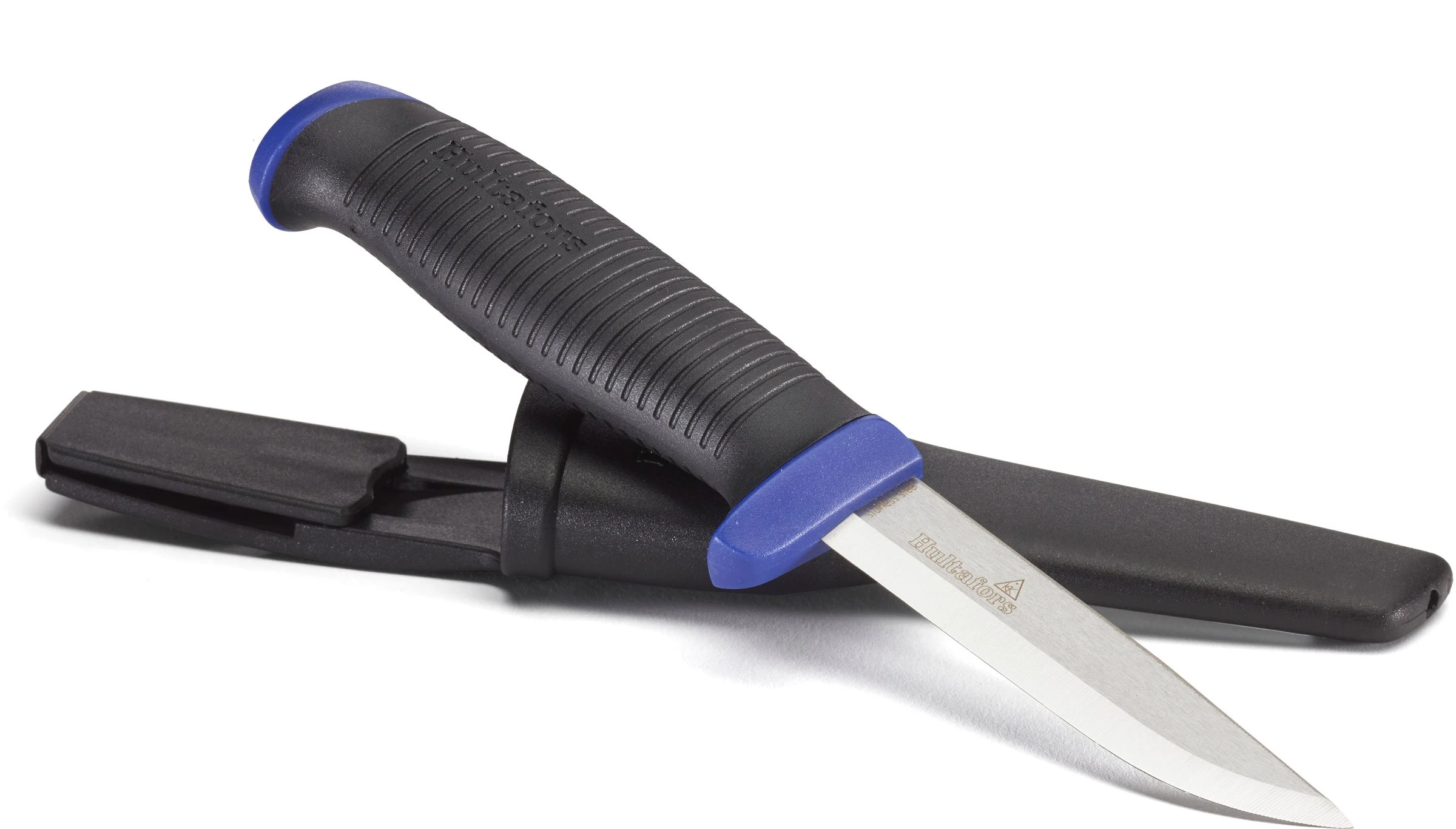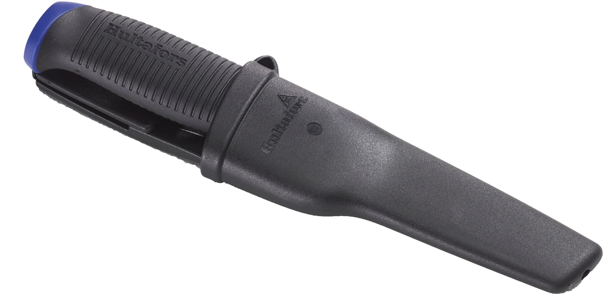 Skede og skæfte er lavet i slagfast polypropylen og skeden kan monteres i såvel bælte som i knappen på arbejdstøjet. Kniven ligger solidt fikseret i skeden, men er nem at frigøre med én hånd.