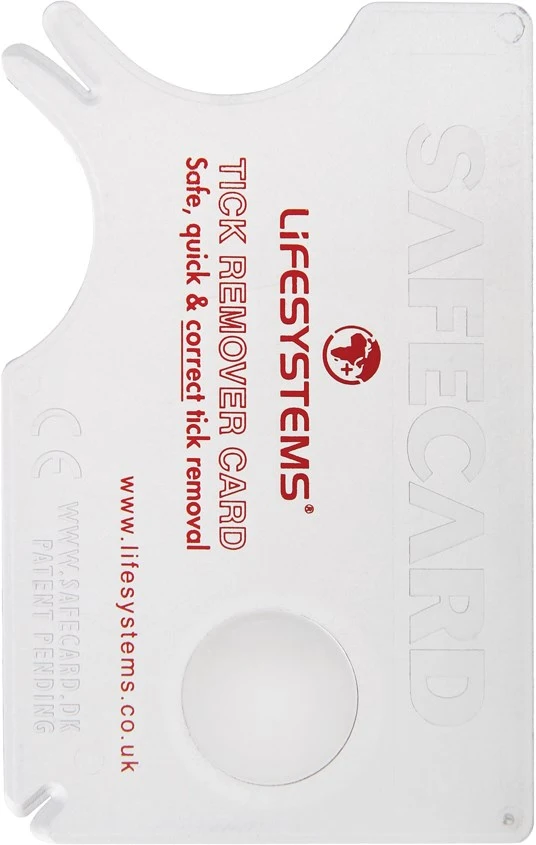 Med dette Tick Remover Card fra Lifesystems® – som fylder som et almindeligt kreditkort – foretages indgrebet nemt og hurtigt. Tick Card Remover er udstyret med to forskellige størrelser greb, så du kan bruge kortet på alle størrelser tæger og flåter. Og det indbyggede forstørrelsesglas gør det muligt at kontrollere, at der ikke sidder kropsdele tilbage i bidsåret.