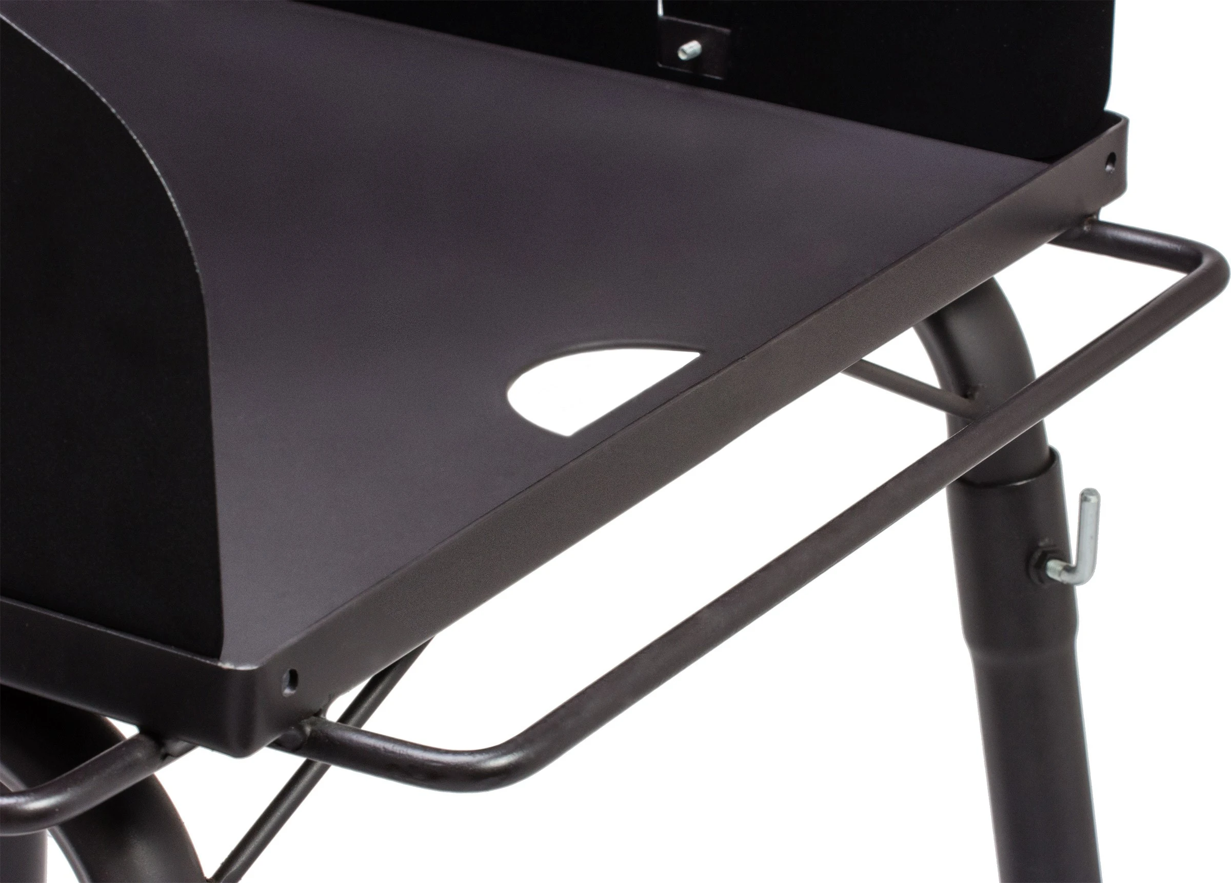 Under madlavningen kan det forskellige køkkengrej, tænger og grillhandsker hænges på siden af bordet, så det hele tiden er indenfor rækkevidde, og hullet forrest på bordpladen gør det nemt og hurtigt at skrabe bordet rent for aske og kulrester.