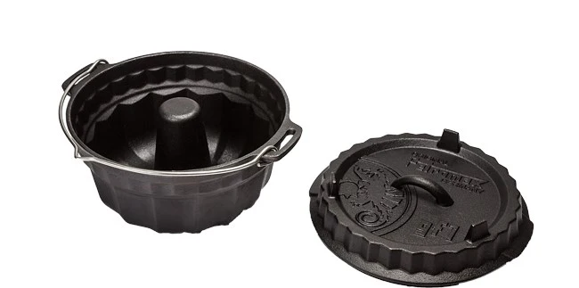 Takket være de fantastiske kendetegn ved støbejern og overfladens særlige struktur, opbevares varmen effektivt og fordeles ensartet. Den forbehandlede overflade gør præparering unødvendig, så denne robuste kage- og brødform kan bruges med det samme. Udendørs bruges den i eller over åben ild eller med kul og briketter. Ring Cake Pan w/Tarte Case Lid GF1 er udstyret med både hank og kraftigt låg med forhøjet kant, som holder gløderne på plads, hvis låget dækkes med gløder. Din Ring Cake Pan w/Tarte Case Lid GF1 opvarmes således fra alle sider og er dermed netop velegnet til bagning af brød.