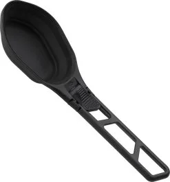 Camp Kitchen Folding Serving Spoon er fremstillet af glasfiberforstærket nylon og er selvfølgelig godkendt til brug med både kolde og varme fødevarer. Endvidere er materialet skånsomt mod gryder og panders eventuelle non-stick belægning.