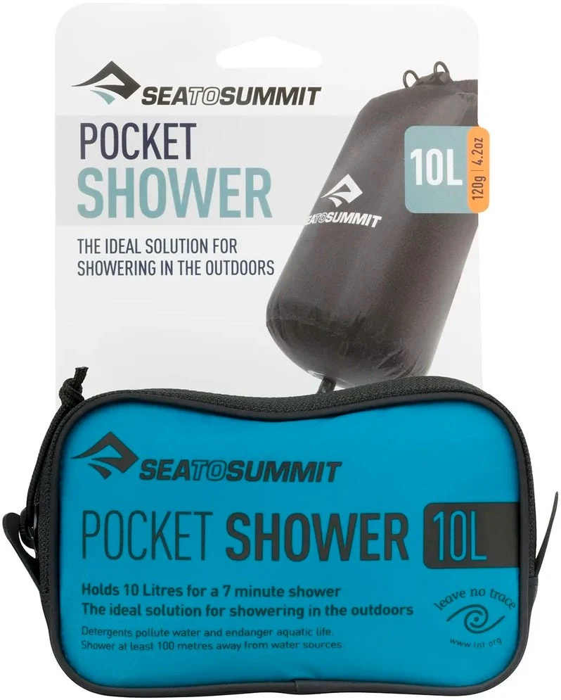 Denne uhyre kompakte, lette (blot 120 gram) og smarte Pocket Shower, 10 L fra Sea to Summit rummer – som navnet antyder – 10 liter og er fremstillet af PU-belagt nylon i en mørk farve, som hurtigt absorberer sollyset, så indholdet bliver lunt. Strålen reguleres nemt og bekvemt på selve brusehovedet og kan lukkes helt, så posen også kan bruges som drybag eller til vandtransport, når den ikke lige tjener sit formål som bidrag til den personlige hygiejne.