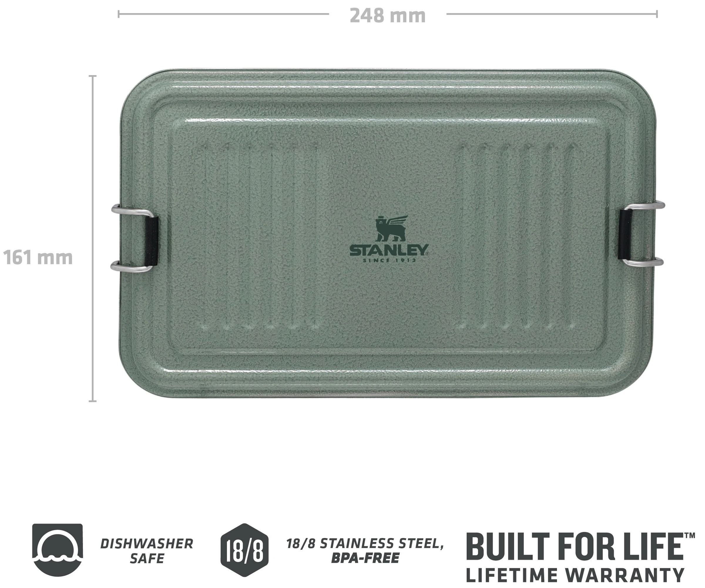 Dette nye familiemedlems design er inspireret af Stanleys klassiske madkasse fra 1950’erne. Den er udstyret med gedigne låse, der holder låget låst, tåler opvaskemaskine og leveres i