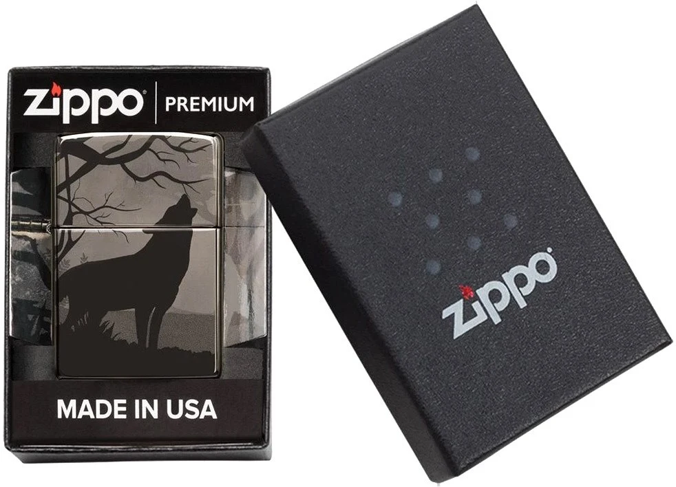 Det meget flotte motiv udgøres af en silhuet af en ulv, der hyler om natten, dybt inde i den mørke skov. Den særlige Photo Image 360°-proces gør, at når lighteren drejes, finder du en anden ulv, der står på vagt. Motivet fylder således elegant hele overfladen ud på denne Black Ice® -lighter.